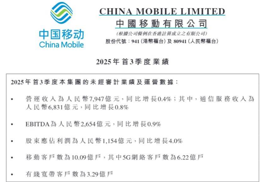 截至2025年9月30日,中国移动移动客户总数达到10.09亿户,其中5G网络客户数达到6.22亿户;有线宽带客户总数达到3.29亿户,首3季度净增1420万户;家庭宽带客户达到2.88亿户,前三季度净增976万户。